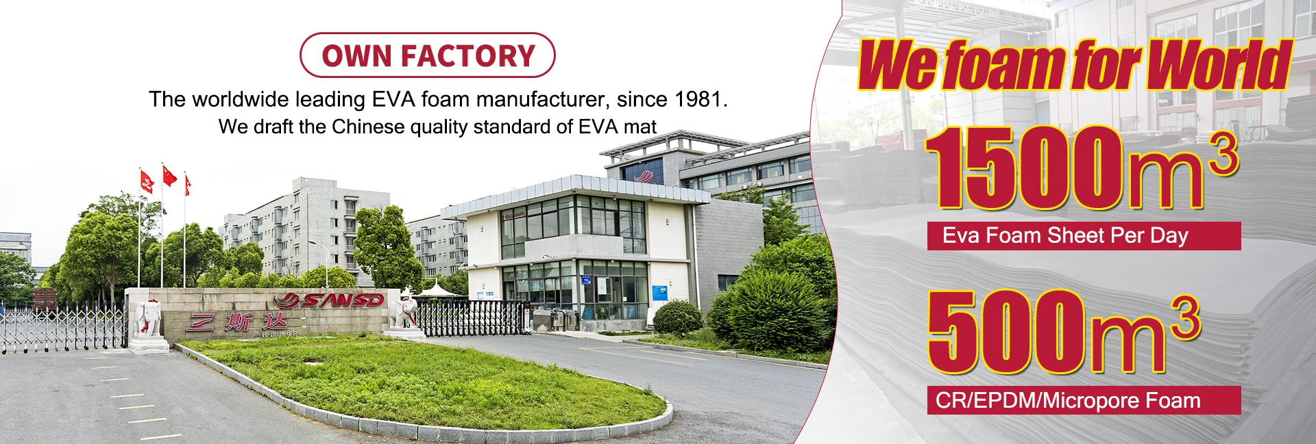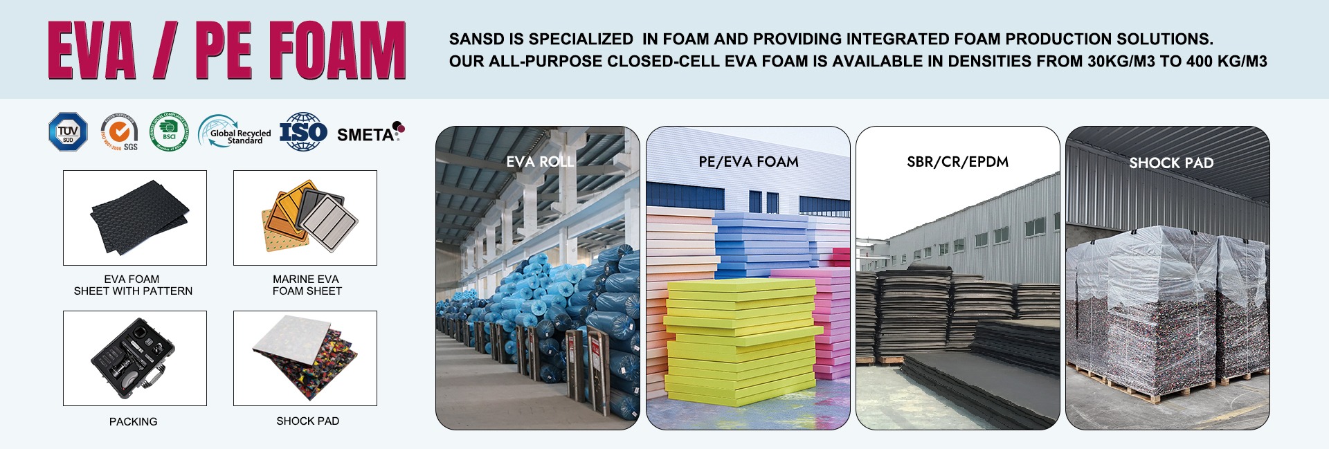 • Welcome to Sansd(Jiangsu)Environmental Technology Co,.Ltd , our company was built in February 2011,  workshop about 130,000 squre meters.  Concentrated with research, development and manufacturing of new type environmental plastic and rubber materials. We can produce different EVA foaming products with different items and colors in sheet, rolls and mats. They are widely used in shoes, luggage, puzzle mat, toy, gymnastic mat, yoga mat, fitness equipment, handicraft, architectural decorations, marine and industry of packaging. The eco-friendly fireproof PE foam, anti-static foam, shock absorption foam, anti-UV foam, and high temperature resistant foam are also widely used in industries of electronics, cars, marine and architectural decoration and so on.